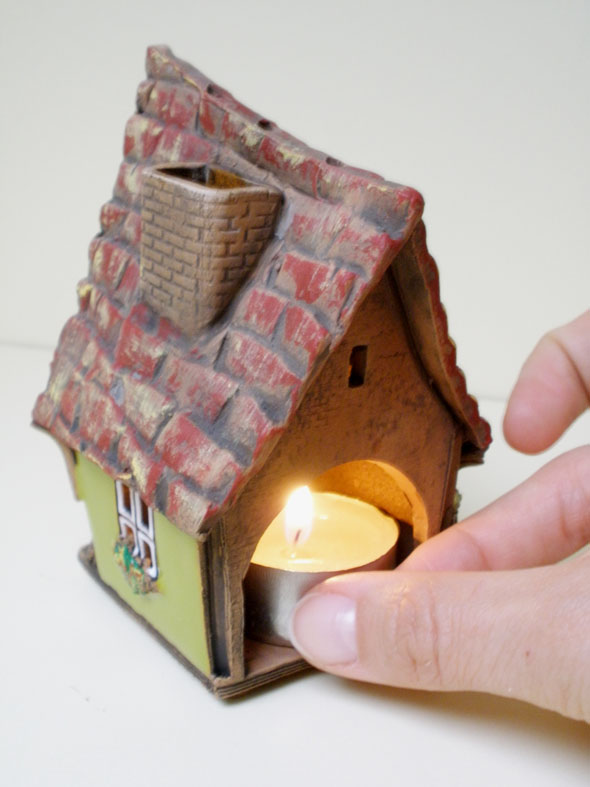 Enciende la vela e introdúcela dentro de la casita para calentar la chimenea.